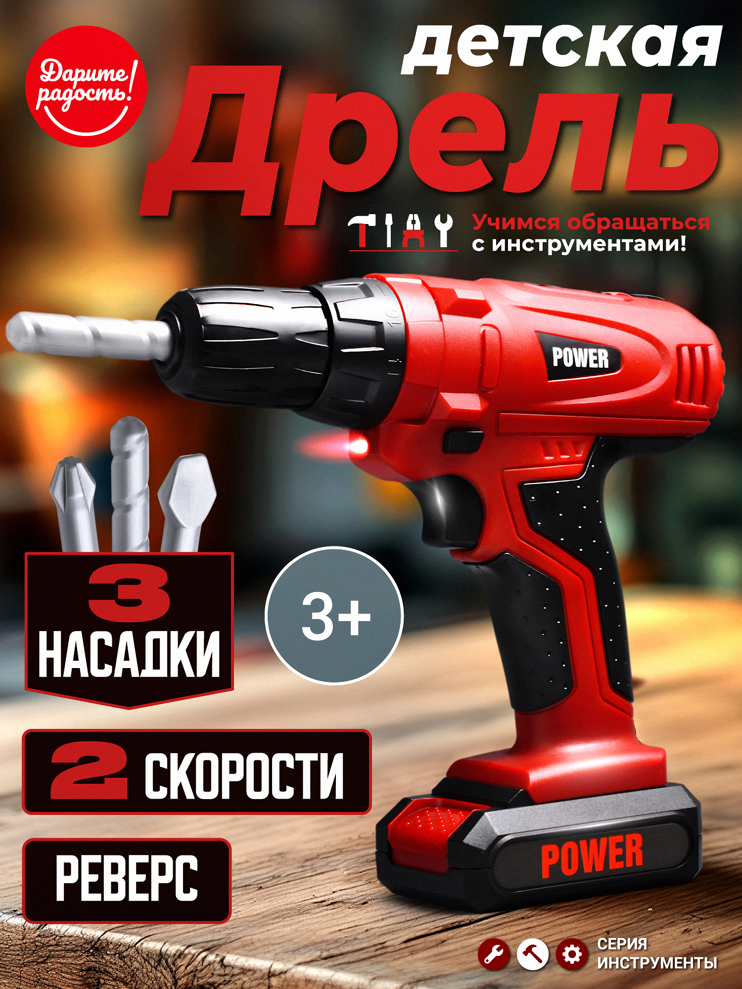 У инструмента есть полезная функция реверса — можно не только закручивать, но и выкручивать. А ещё после того, как шуруп затянут, дрель издаёт реалистичный трещащий звук, имитирующий работу настоящего инструмента с трещоткой.