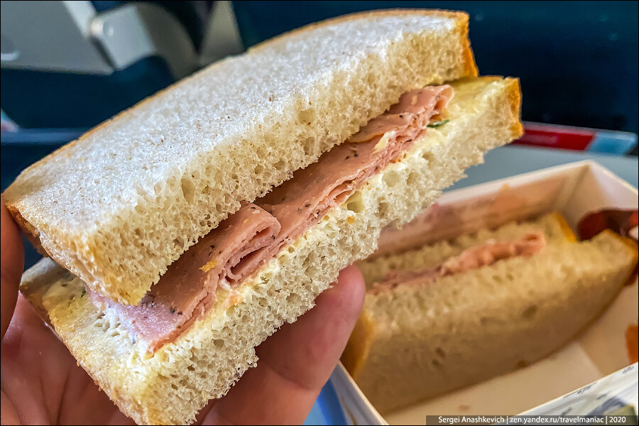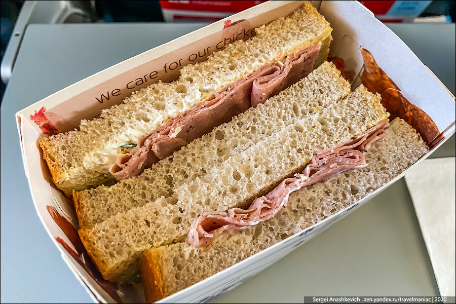 Разрезанный хлеб для тостов — явно не самая лучшая идея для холодного бутерброда. Вот если бы его чуть поджарили перед подачей, думаю, было бы намного вкуснее. Но … в самолете никто поджаривать ничего не будет.