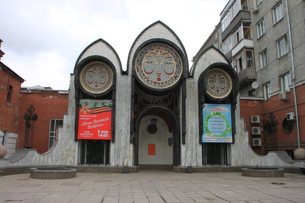 Буквально в двух шагах притаилось чудесное здание Кукольного театра, построенное в конце 1990-х. Оно такое же игрушечное и сказочное, как и спектакли, что в нем идут. Помимо фасада, напоминающего матрешку, здесь есть очень интересные, стилизованные фонари.