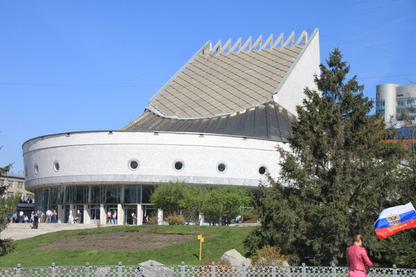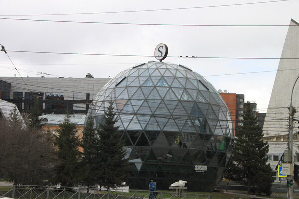 Рядом с ним обратите внимание на круглое стеклянное здание кафе — образец постперестроечного хай-тека. Говорят, именно с него в Новосибирске началась мода на подобные прозрачные конструкции.