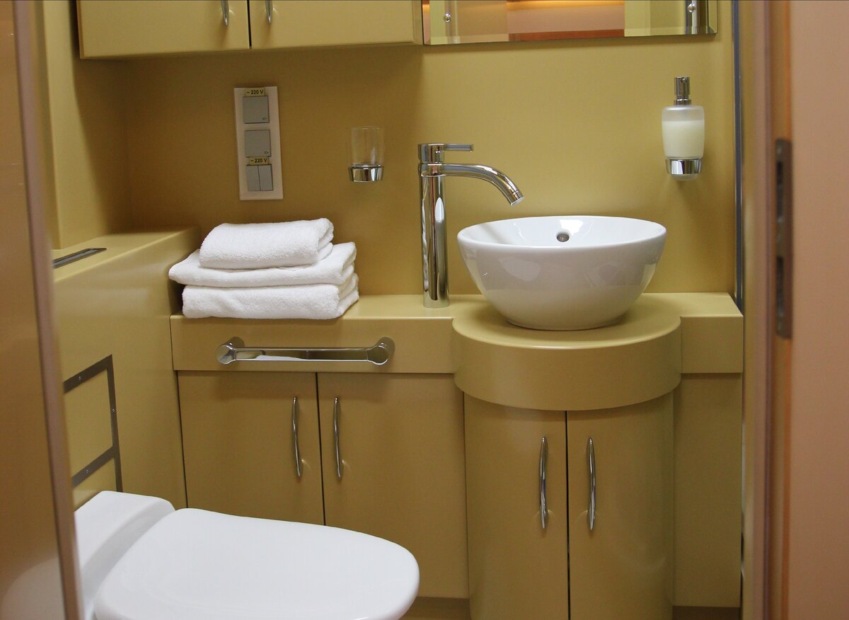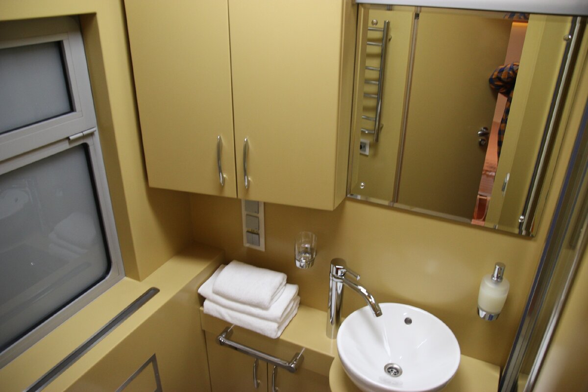 Из купе – вход в индивидуальный санузел, где можно принять душ в пути следования.