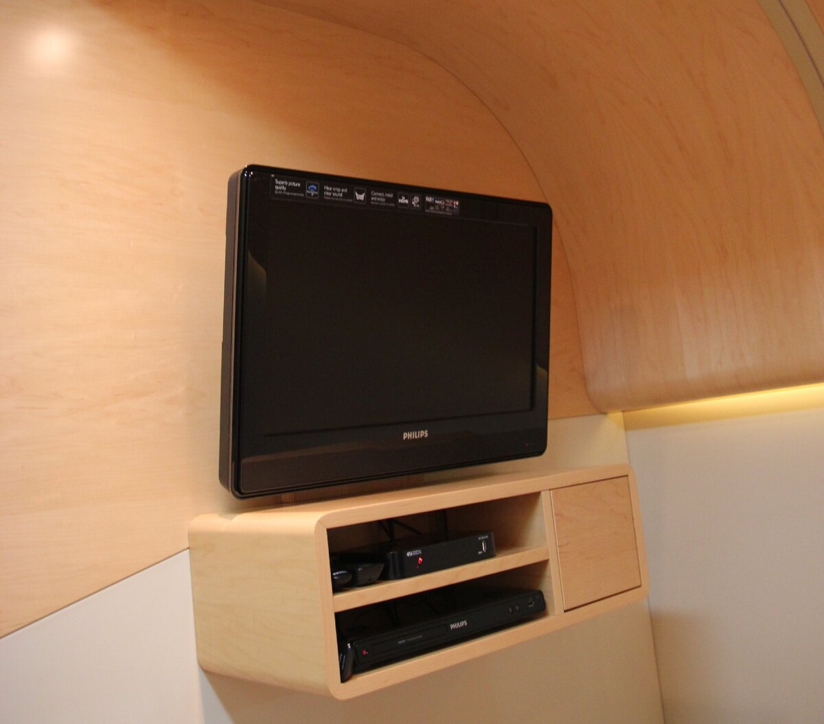 Теперь пойдем смотреть в купе. Дверь в купе – не раздвижная, как в классических вагонах, а на петлях. Внутри – большая двухспальная кровать, шкаф, столик, телевизор. Обратите внимание, какой комфортный матрас. Кстати, жалюзи на окне открываются и закрываются с пульта управления.