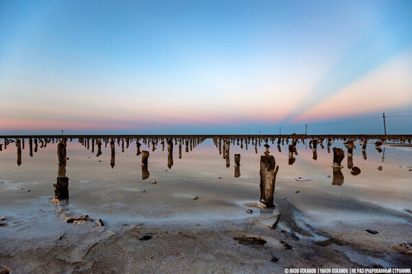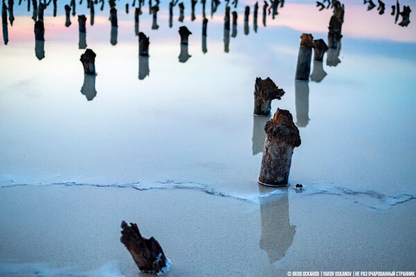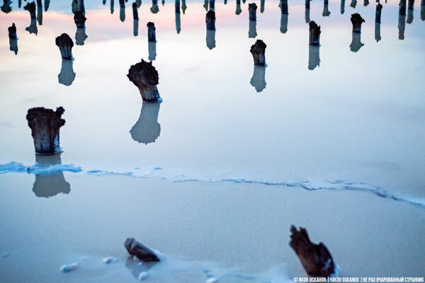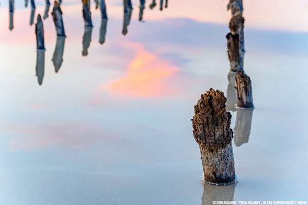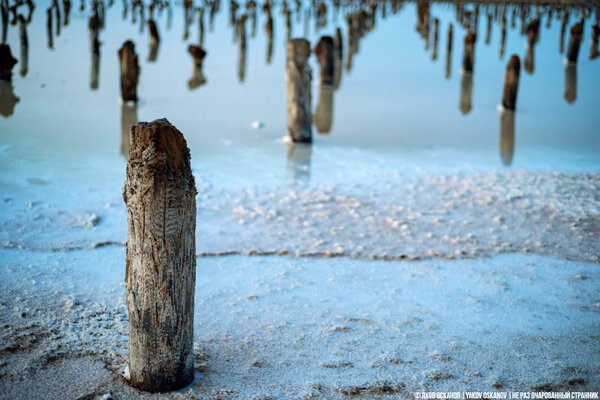 Прогуливаясь по берегу, я обратил внимание на странные деревянные столбики, торчащие из соляной корки. Оказалось, это не просто палки — это исторические метки! Ещё с XVII века здесь работали соледобытчики. Они выкладывали соль на специальные платформы, установленные на этих столбах, давали ей просохнуть, а потом грузили на арбы, запряжённые волами и верблюдами. Так соль начинала свой долгий путь по бескрайним просторам России.