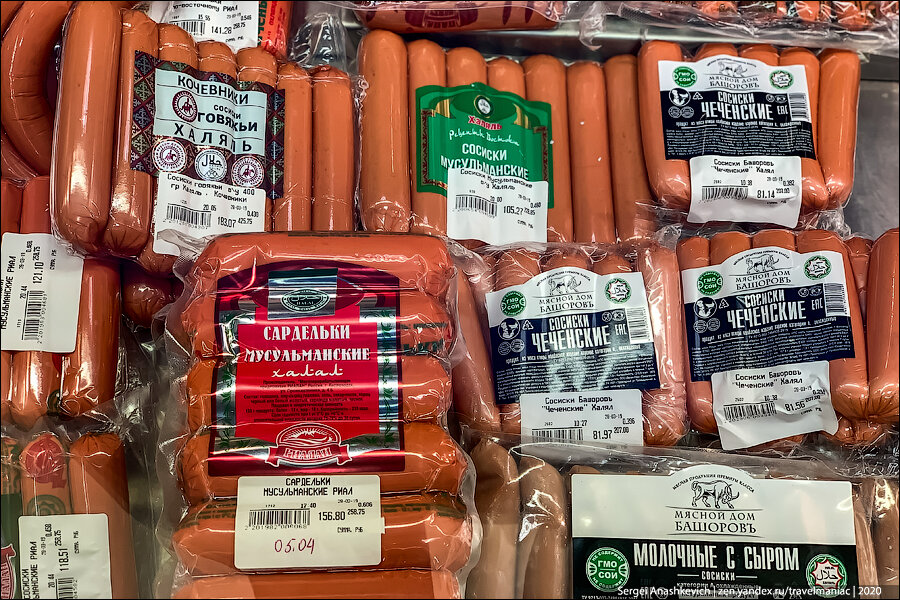 Мусульманские и чеченские сосиски я уже показывал вчера. Тоже почти не найти в остальной России.