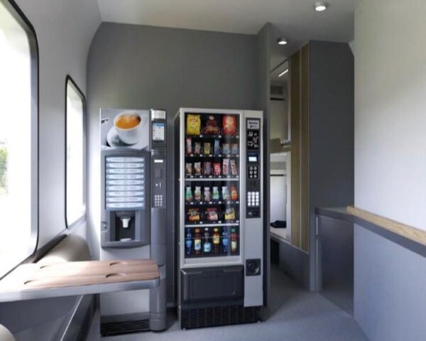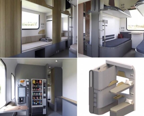 Также видно, что возле каждого места появятся не только розетки для зарядки устройств, но и индивидуальные светильники для чтения. Кроме того, в вагоне планируется общая зона с автоматами по продаже горячих напитков и снеков.