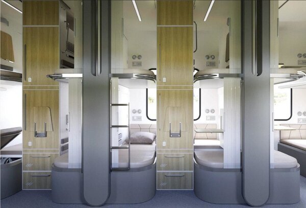Среди явных новшеств можно отметить полностью закрытое пространство под нижней полкой — по сути, это большой рундук для багажа. На уровне второй полки предусмотрены столики. А вот третьей, верхней полки, традиционной для классического плацкарта, в новой модели не будет.