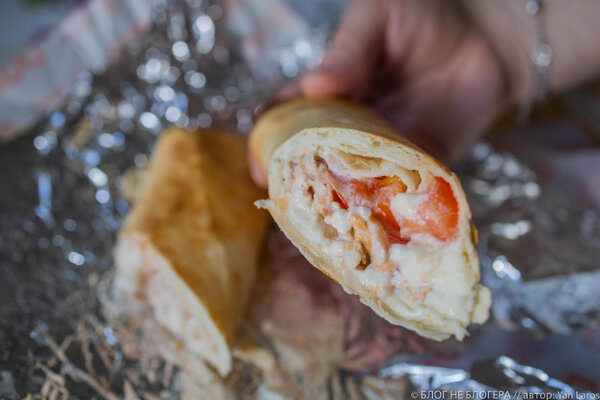 Внутри — помидоры, курица и много сыра. Очень вкусная и сытная штука.