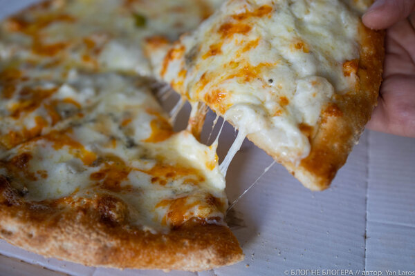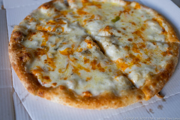 Сырная пицца полностью оправдала своё название — сыра в ней было действительно много, и это было видно невооружённым глазом.