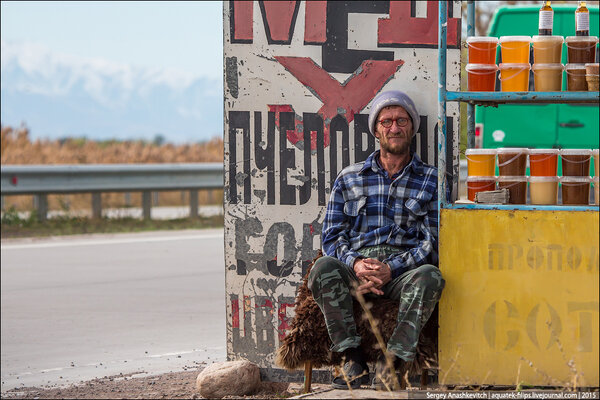 Пчеловод, развернувший свою торговлю прямо у дороги.