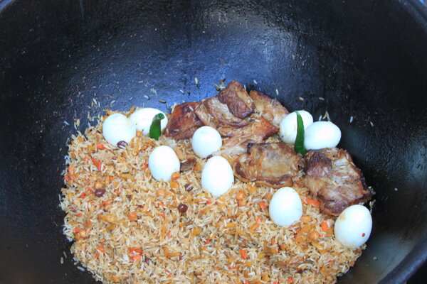 Однако чаще всего я видела плов с добавлением нута. Для меня это было в новинку. Мясо лежало сверху крупными, аппетитными кусками. А потом я и вовсе обнаружила казаны, где среди риса и нута красовались вареные яйца. Как все эти ингредиенты могут сочетаться? Оказалось, что могут — и еще как!