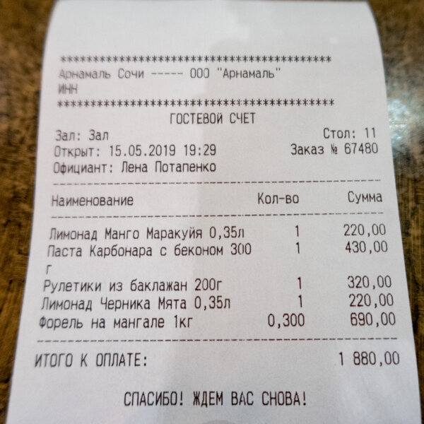Общая сумма чека составила 1880 рублей.