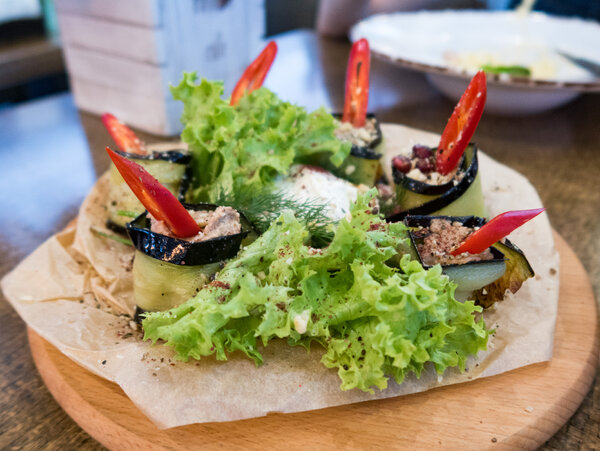 1. Рулетики из баклажанов — 320 рублей. Нежное и ароматное блюдо, отличное начало ужина.