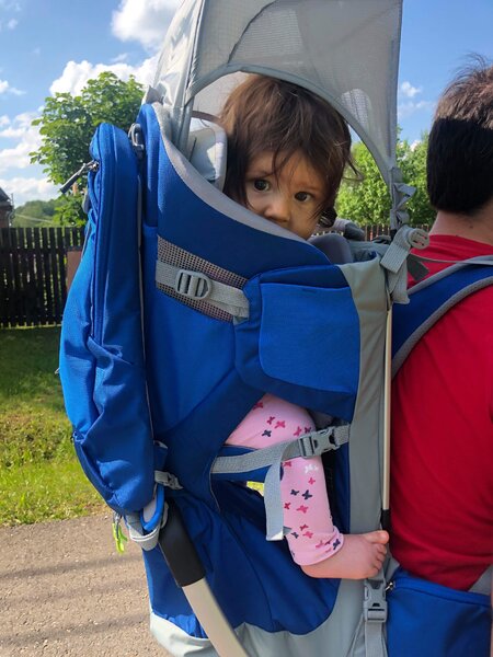 Участник эксперимента — дочь, 8 месяцев, вес 9 кг, характер спокойный и стойкий, на искусственном вскармливании. Снаряжение — рюкзак-переноска Thule Sapling Elite. Конструкция предполагает ношение как обычного рюкзака, но за спиной у тебя находится ребенок, надежно закрепленный системой ремней. Сзади также расположен полноценный рюкзачный отсек на 24 литра, куда помещается весь необходимый скарб: подгузники, смесь, запасная одежда.