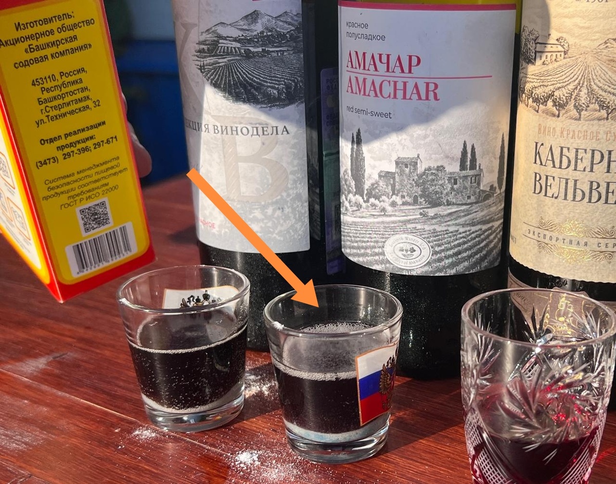 В просмотренных мной роликах сода, попадая в вино, начинала шипеть. Причем это происходило и с натуральным, и с порошковым вином, так что сам по себе звук реакции — не показатель.