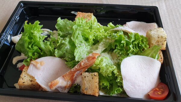 Салат оставил двоякое впечатление. Ингредиенты были нарезаны небрежно, а соус, почему-то налитый на дно контейнера, размазался по стенкам. На вкус он был неплох, но порция за 220 рублей, на мой взгляд, не стоит таких денег.