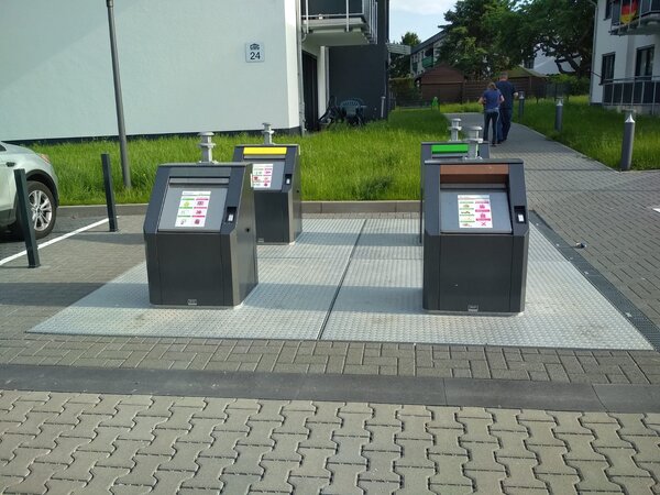Блестящие «ящики» — это подземные мусорные контейнеры. Во всех домах есть лифты, несмотря на то, что здания всего трёхэтажные с подвалом. Это сделано для удобства жильцов с ограниченными возможностями.