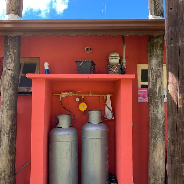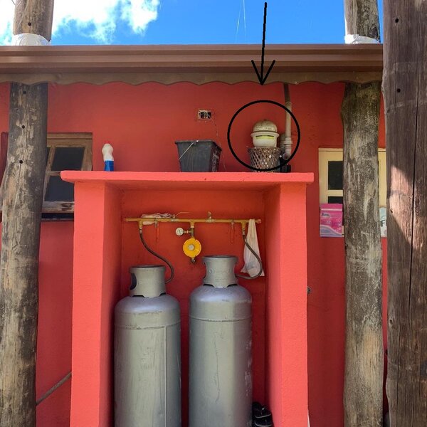 Как раз в эти выходные газ закончился, и нам привезли полный баллон. Доставщик приезжает на мотоцикле с прицепом, сам меняет и подключает баллон — я никогда туда не лезу.