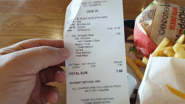 Вы, наверное, обратили внимание, что на ценнике витрины указано ровно 7 евро. Почему же в чеке появилась разница? Всё дело в местной системе налогообложения: на Кипре цены в меню традиционно указываются без учёта налогов, которые добавляются уже на кассе.