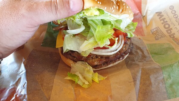Он действительно оказался большим и, что важнее, очень вкусным. Две сочные котлеты, плавленый сыр, свежая зелень, лук и помидоры — всё как должно быть в хорошем бургере.