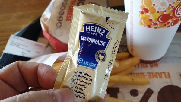 К моему заказу бесплатно приложили два пакетика с соусами: майонезом и кетчупом. В российских ресторанах этой сети соусы обычно платные и упакованы иначе.