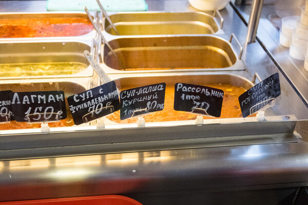 Выбор довольно разнообразный: здесь представлены салаты, первые и вторые блюда, гарниры, а также богатый ассортимент выпечки и десертов.
