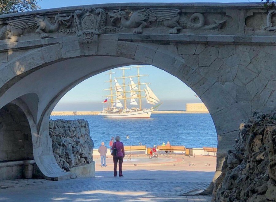 Мостик влюбленных и парусник Херсонес в Севастополе.