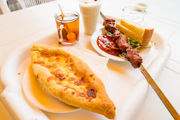 Выбор блюд оказался крайне ограниченным, если не сказать скудным. В меню были только шашлык и хачапури. Причем последнее лишь отдаленно напоминало хачапури по-аджарски — форма лодочки была, но на этом сходство заканчивалось.