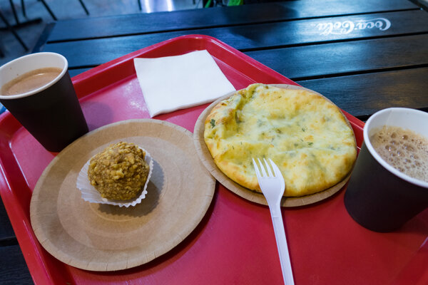 Я взяла лепешку с сыром и зеленью за 130 рублей и капучино из автомата за 100. В итоге наш скромный перекус обошелся в 460 рублей. Сумма, конечно, немаленькая для такой еды, но мы изначально не ставили цели плотно поесть — договорились, что нормально поужинаем уже по приезде в Горки-город.