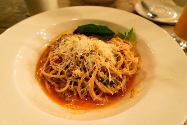 На основное я выбрала пасту болоньезе — 500 рублей. Блюдо вкусное, но цена ощутимая.
