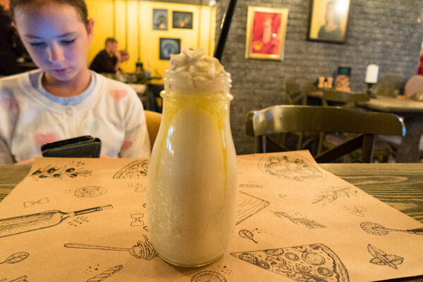Дочка взяла ванильный коктейль за 250 рублей — вкусный, с обильной порцией мороженого и взбитых сливок.
