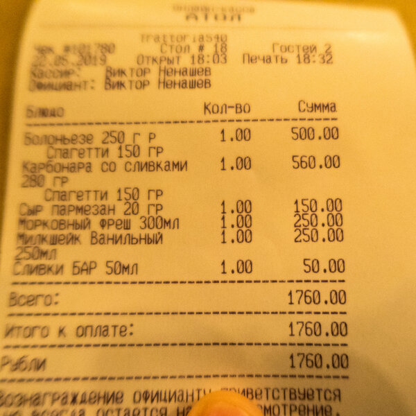 Общий счет на двоих составил 1760 рублей — сумма немаленькая. Цены показались мне сопоставимыми с московскими, хотя, возможно, это субъективное впечатление.