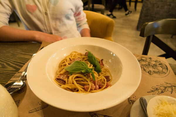 Дочка, конечно, взяла карбонару — 560 рублей. Но, к удивлению, подали её без сыра. Пармезан оказался отдельной позицией: 20 грамм — 150 рублей. Та же история, что и со сливками к соку.