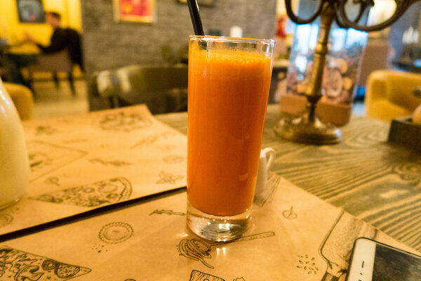 Я заказала морковный фреш — тоже 250 рублей. Плюс отдельно сливки — еще 50 рублей. Здесь многие позиции разбиты на составляющие: если в других кафе морковный сок часто подают сразу со сливками, то здесь это два разных пункта в меню. За счет таких дополнений итоговая сумма растет — прием, знакомый по многим ресторанам, но не самый приятный для посетителей.