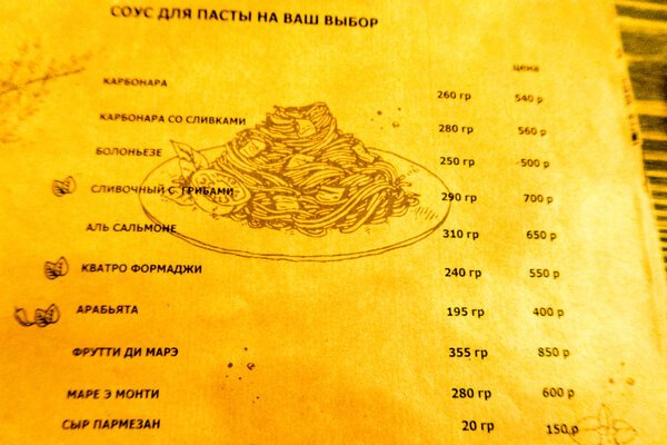 Решили поужинать в «Траттории 540» — заведении с итальянской кухней. Моя дочка обожает пасту, так что выбор был предопределен. Место действительно симпатичное, уютное, кухня и обслуживание на уровне, но цены... заметно выше, чем, например, в Адлере — примерно на 100 рублей за каждое блюдо. И такая тенденция, как я позже заметила, характерна для многих заведений в Горки-городе.