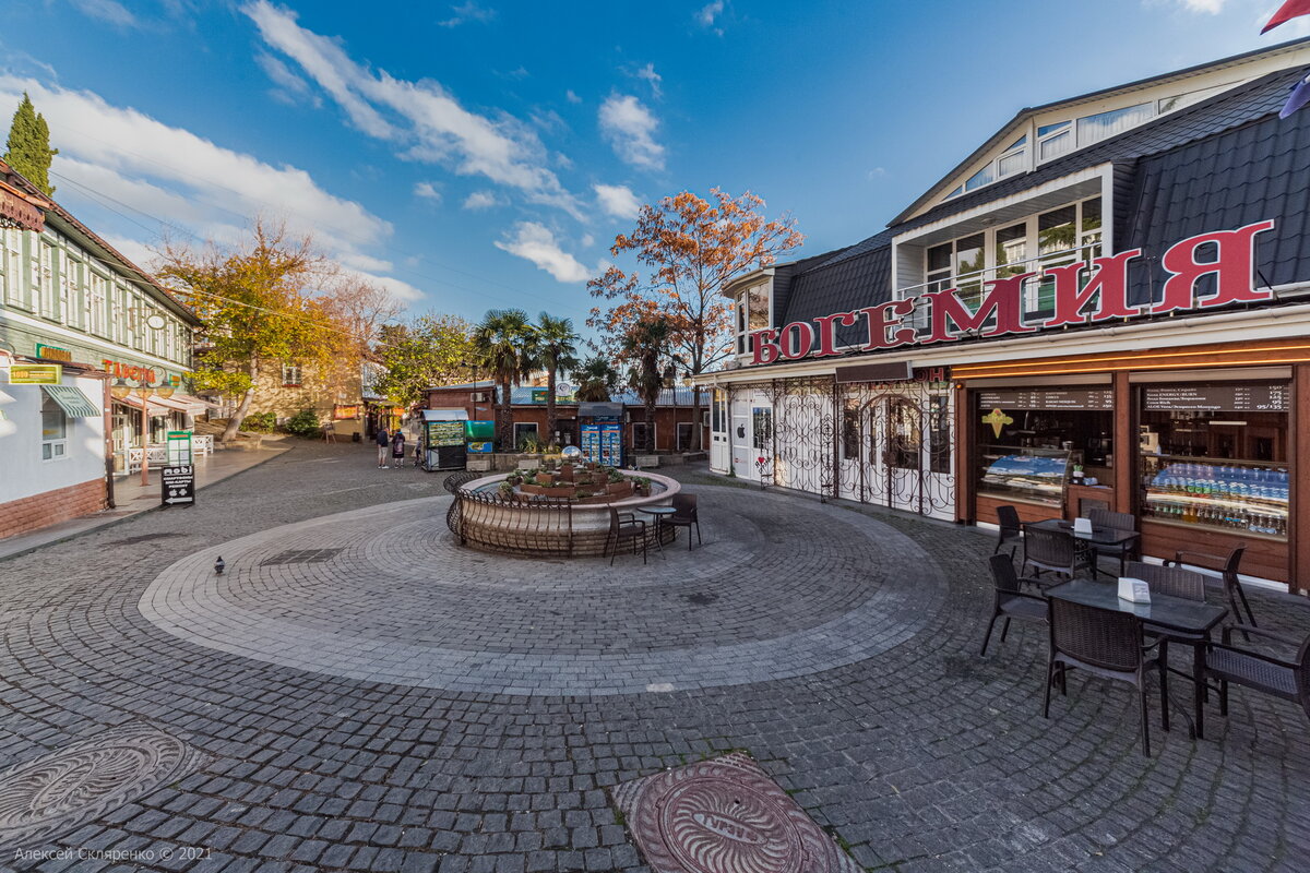 Ниже начинается набережная Пушкина, вдоль которой выстроились рестораны и все прочие атрибуты курортной жизни. В конце осени активность здесь спадает, но некоторые заведения и торговцы всё же работают.