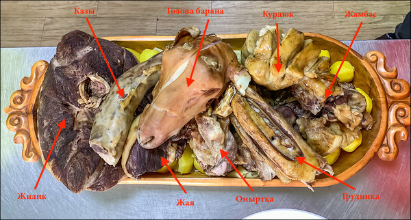 Настоящий казахский бешбармак, вопреки некоторым описаниям, подается с крупными, цельными кусками мяса. Каждый из них имеет свое сакральное значение и занимает строго отведенное место на блюде. Раздают их в соответствии со статусом и возрастом гостей.