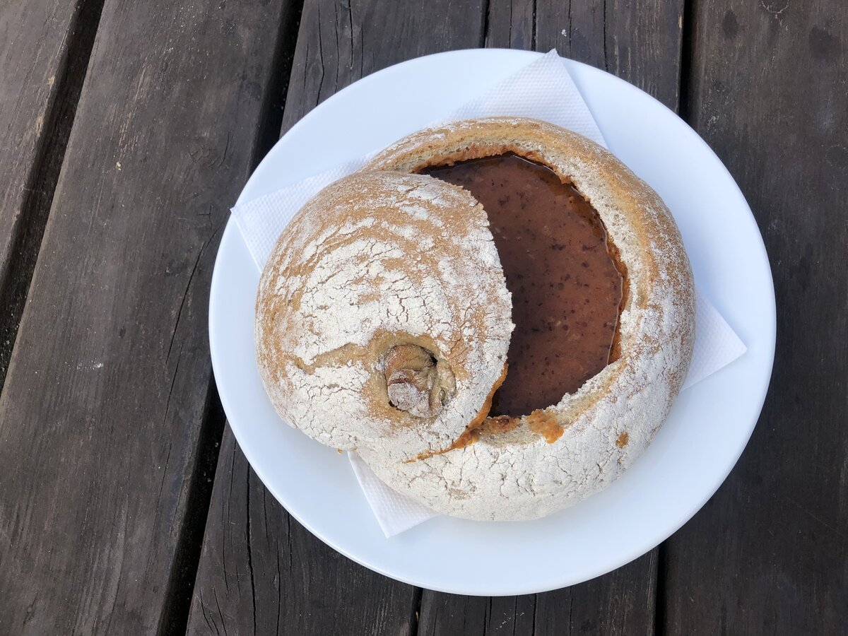 Но лично для меня вершиной чешского супового искусства является полевка в хлебе (Polévka v chlebu), которую часто называют gulašova polevka. Это невероятно сытный, мясной и ароматный гуляшевый суп, который подают в съедобной «тарелке» — половинке свежего хлеба.
