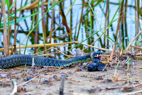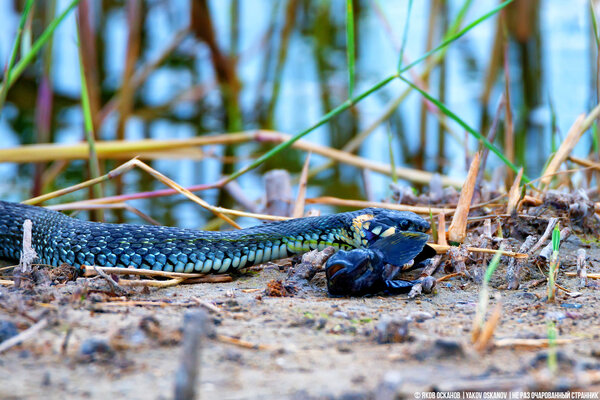 Вот это действительно удача для натуралиста! Я успел сделать несколько кадров, пока уж наслаждался своей трапезой. Потом, конечно, я его поймал и… тоже съел. Шучу, конечно! Хотя с точки зрения ужа такой поворот событий был бы крайне несправедливым.