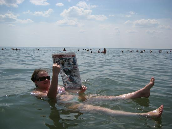 Основная цель поездки для большинства — это, конечно, Большое соленое озеро. Вода в нем даже в начале сезона показалась мне не самой чистой, и страшно представить, что там творится к августу. Из-за высокой плотности и сильной солености купаться в нем довольно неприятно. Я зашла в воду исключительно ради эксперимента. Порадовал только один факт — утонуть здесь действительно невозможно. Многие отдыхающие специально фотографируются с газетой в руках, демонстрируя этот удивительный феномен.