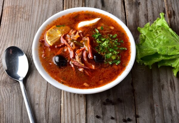 Однако солянку ему всё-таки предложили, на свой страх и риск, описав её просто как «суп из разных видов мяса и колбасы». И — о чудо! — Тому она тоже понравилась! Он не заподозрил подвоха, и я не стала его шокировать, рассказывая об истинном составе, когда он делился впечатлениями. Правда, лимон в суп он так и не положил, предпочтя бросить его, как обычно, в свою колу. Да, и солянку он тоже запил колой! Ну что это за привычка?