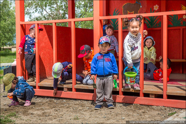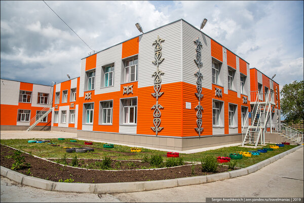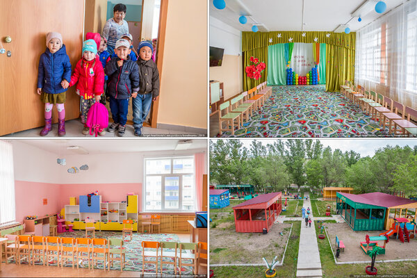 Вчера я рассказывал о казахском поселке, где многие дома обветшали, а дворы находятся в запустении. Казалось бы, в таком месте трудно ожидать чего-то современного и ухоженного. Но реальность превзошла все ожидания: среди этой скромной обстановки я обнаружил не только аккуратные таблички с номерами домов, но и нечто совершенно удивительное — современный, прекрасно оборудованный детский сад.