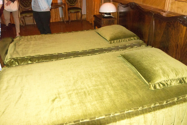 Через переход попадаем на дачу Сталина. И здесь подлинных элементов немного — в основном деревянные панели на стенах и кровати, застеленные самыми обычными покрывалами. Помещения довольно мрачные, со слабым освещением, что объясняют нелюбовью вождя к яркому свету.