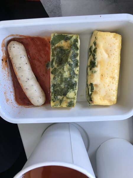 Третий возможный выбор — омлет. Из прошлых поездок я помнила, что он далек от идеала, но альтернатив не было, и на второй завтрак я взяла именно его. Не понимаю, как можно приготовить омлет настолько безвкусным, что он даже не ассоциируется с яйцами. К нему прилагалась сосиска, чей вкус тоже оставлял желать лучшего.