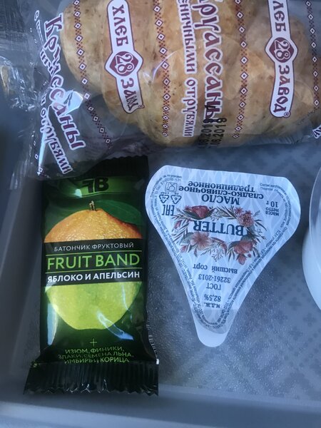 Также в набор входят зерновой круассан, ломтик серого хлеба, масло, джем, йогурт, а также шоколадка или небольшой фруктовый батончик. Батончик довольно посредственный, а шоколад — самый обычный.