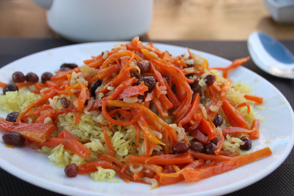 Из всех испробованных вариантов пальму первенства я отдаю бухарскому плову. Его готовят слоями, а в составе щедро присутствует ярко-красная морковь и изюм. На мой вкус, эта версия оказалась самой легкой и наименее жирной. Мне также пришелся по душе его сладковатый оттенок, который дают упомянутые морковь и изюм — я вообще обожаю, когда в мясных блюдах чувствуется легкая сладость. Другие виды плова показались мне несколько тяжеловатыми. Мне рассказали, что исторически этот рецепт считался праздничным, свадебным, но сегодня в Бухаре его готовят и в будни, делая каждый день немножко праздником.