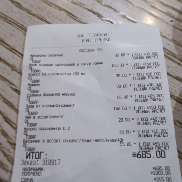 Общая сумма чека за обед на троих составила 685 рублей. После цен Краснодарского края этот вариант показался мне даже очень бюджетным.