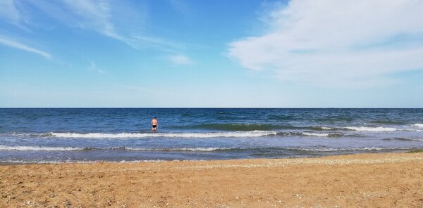 Как и Азовское, оно радует протяженными песчано-ракушечными пляжами с пологим заходом. При этом вода здесь чистая, прозрачная и имеет насыщенный синий оттенок, чем напоминает Черное море. Что касается глубины, то она идеально сбалансирована — не слишком мелко, как в Азовском, но и не так глубоко, как в Черном, что делает купание комфортным и безопасным.