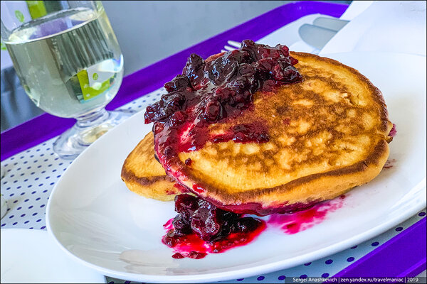 Бортпроводница предложила обмен: она отдала мне порцию оладий с великолепным черничным вареньем из меню для экипажа, а я отдал свой невостребованный омлет. Так я невольно познакомился не только с предложениями бизнес-класса, но и с тем, что ест сам экипаж во время полёта.