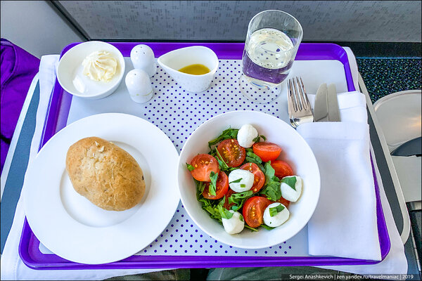 Поскольку рейс из Усть-Каменогорска был утренним, на борту сервировали завтрак. На выбор предлагали два салата, а на горячее — омлет или равиоли. Я выбрал классический итальянский салат с моцареллой. Его подали на подносе вместе с оливковым маслом для заправки, свежей булочкой и взбитым сливочным маслом. Как и положено в бизнес-классе, приборы были металлическими, что добавляет ощущения основательности.