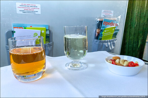 Даже на относительно коротком перелёте пассажиров бизнес-класса ждёт полноценное многоэтапное обслуживание. Оно включает аперитив, закуску, основное блюдо и завершается чаем или кофе с десертом. Всё как в хорошем ресторане, только на высоте десяти километров.